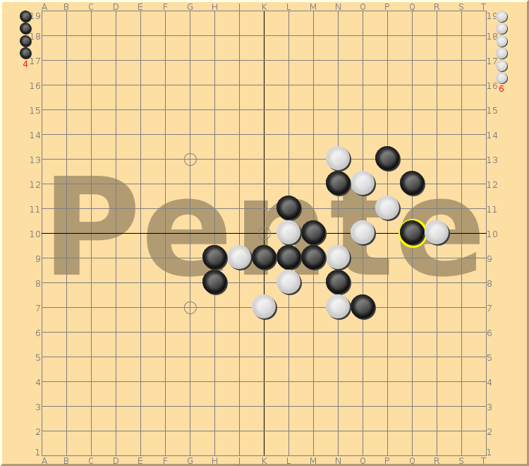 A w Poof Pente czarny dostawiając tak kamień popełniłby tak jakby samobójstwo, tzn. potraktowane by to zostało jako zbicie na korzyść białego i dwa czarne kamienie zostałyby usunięte z planszy.